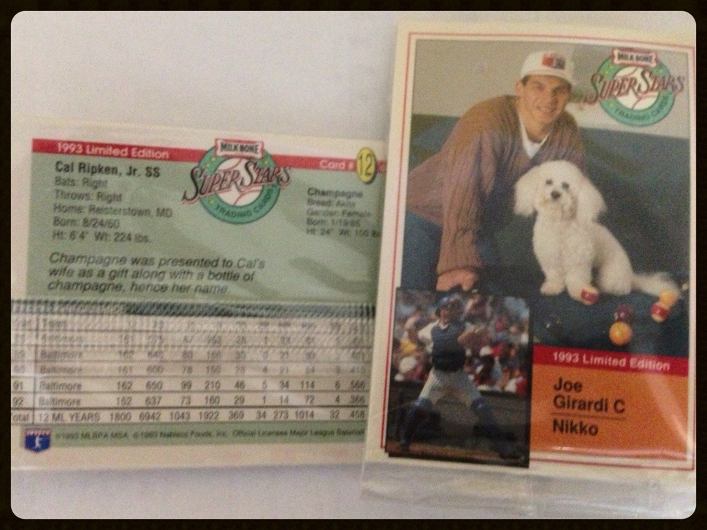 While searching through personal photos to use for this blog, I found my father’s baseball collection. It’s not the one from his childhood, my grandmother threw that out when she was cleaning her closets. The strangest cards I found are the Milk Bone super stars trading cards. Current Yankees captain Joe Girardi is posing with some sort of white fluffy thing, maybe a Bijon frise. I thought it was some sort of way to make money and bring attention to animal adoption. Then I read the description of Cal Ripken Junior’s dog, Champagne. Champagne was presented to Cal’s wife as a gift along with a bottle of champagne, hence her name. It’s an Akita if anyone cares, but these things are in plastic and I don’t want to take them out so I’ll never see the front of it. There are two cards per pack. Bill Swift’s cocker spaniel, Zach, is blocking Cal’s precious Champagne.