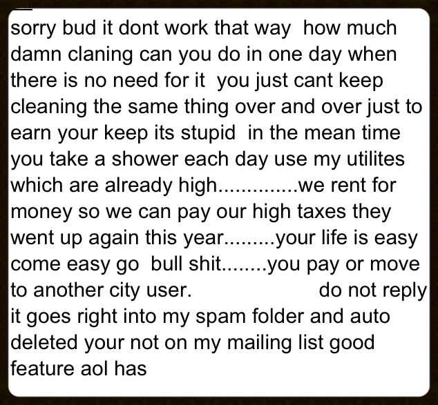 Besides this response, I’ve gotten a lot of legitimate offers for rooms in exchange for labor. Everything from someone who needs help fixing up an investment house to a woman with terminal cancer, who needs someone to mow the lawn, make small repairs around the house and someone to drive her to her medical appointments now that she can no longer drive. She told me she is not dying enough to have insurance pay for someone to do those things yet.