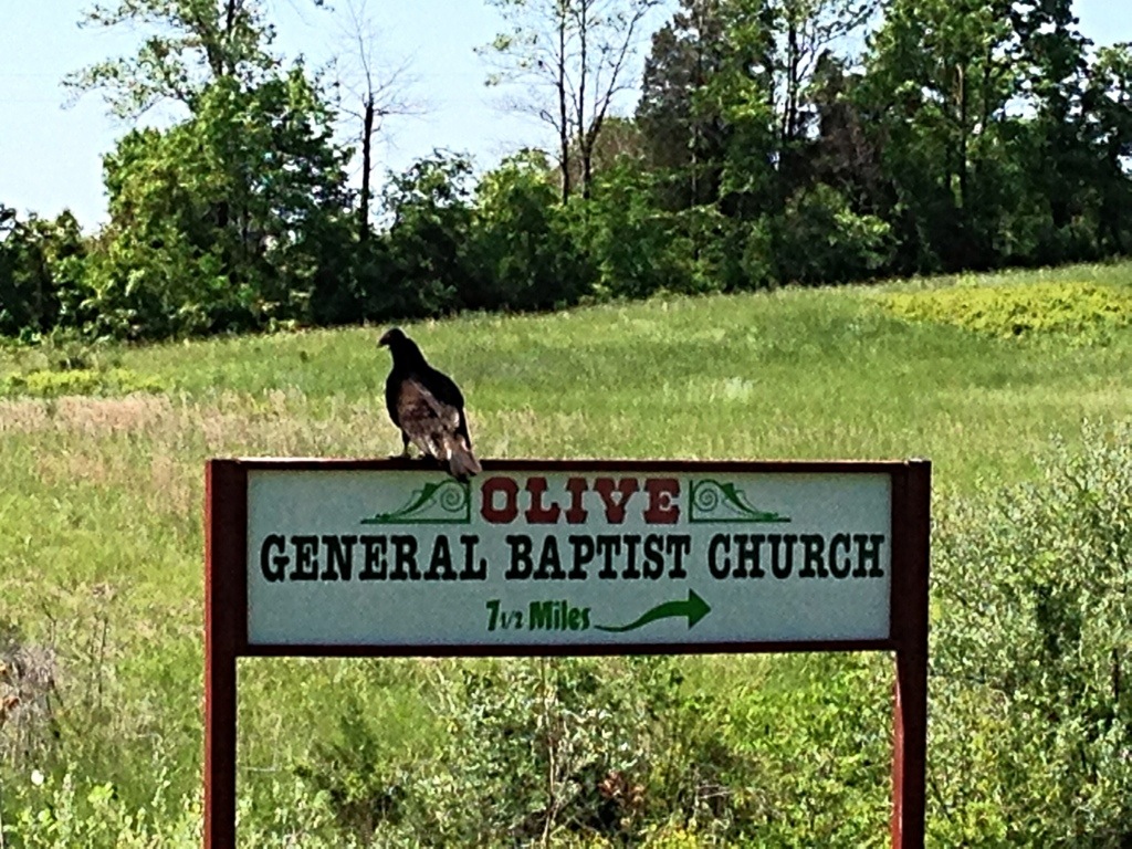 A turkey vulture is not the best advertisement for a church. But it’s another example of animals seen from the car. Yesterday I took a nine mile hike in the wild and all I saw were Mosquitos and this stupid dead snake.