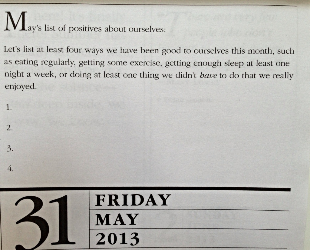 Today the feminist/humanist calendar says to list positives about ourselves to celebrate the end of this month. “Let’s list at least four ways we have been good to ourselves this month, such as eating regularly, getting some exercise, getting enough sleep at least one night a week, we’re doing at least one thing we didn’t have to do that we really enjoyed.”