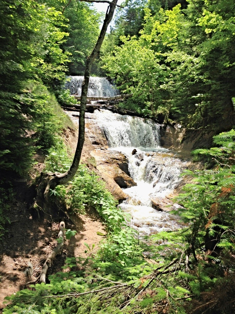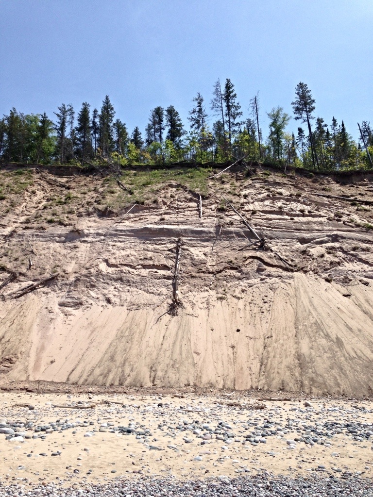 I entered through a forested area with the waterfall and popped out onto one of the most spectacular beaches. The dunes are enormous and dramatic with trees hanging off the edge and falling off every now and then. The mixture and the color of the different types of rocks, which have been eroded to uniform shapes and sizes, showing through the crystal-clear water is like nothing I’ve seen before. Pictured Rocks is a good name.