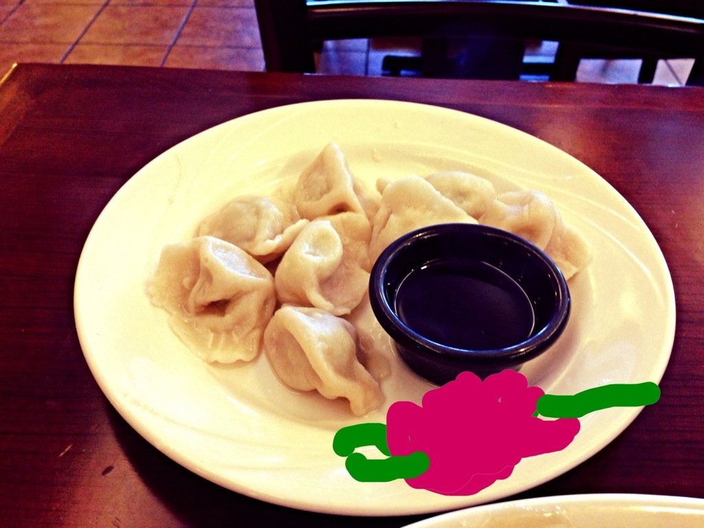 I was suspicious of the dumplings when they came out because they looked like Russian pelmeni, not Chinese dumplings. Watery and boring. Even the presentation was so blah I had to draw some garnish not to offend anyone reading this. That is a rose I made from a radish resting on something green.