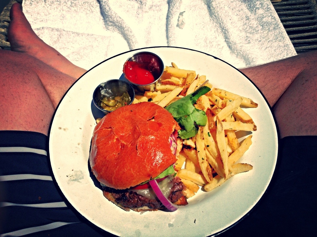And they think they invented food. Which I’ve come to see as a good thing. I asked the bartender how the food is here at the Ace. He said all the food here is very foodie. So foodie is now an adjective. He was right. The sunshine burger, made of ground brisket was kick ass. Served on a huge brioche with crisp lettuce, red onions, tomatoes and savory pickles, I have been having phantom tastes of it for the past day. The seasoned french fries taste like they were made with duck fat. I couldn’t believe I was eating a big fatty meal while sitting in the direct sunlight while it was 107°.