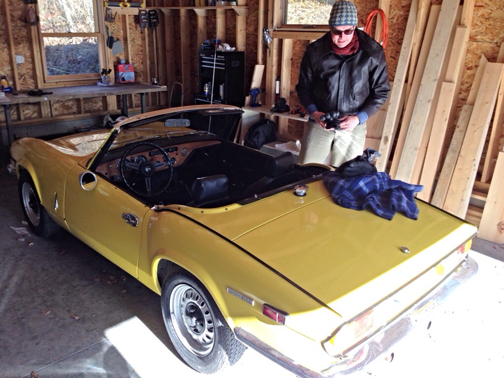 Since My last visit, Gareth bought a bright yellow ’73 Triumph Spitfire. Even though it does not have a top and it was 30 something degrees, we took it out for a spin. Hence the blue blanket in the below photo.