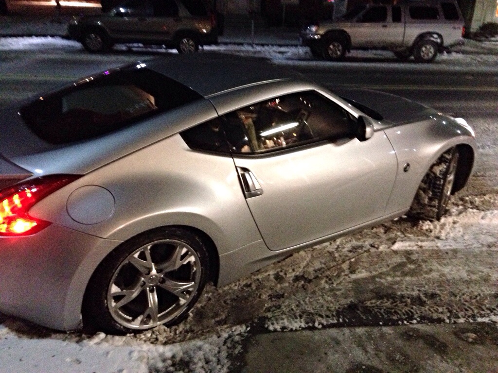 Pictured is my car stuck in one inch of snow in Montpelier, Vermont. I had to break out the rocksalt. Fortunately, some strapping young maple-syrup-eaters offered to give me a push.