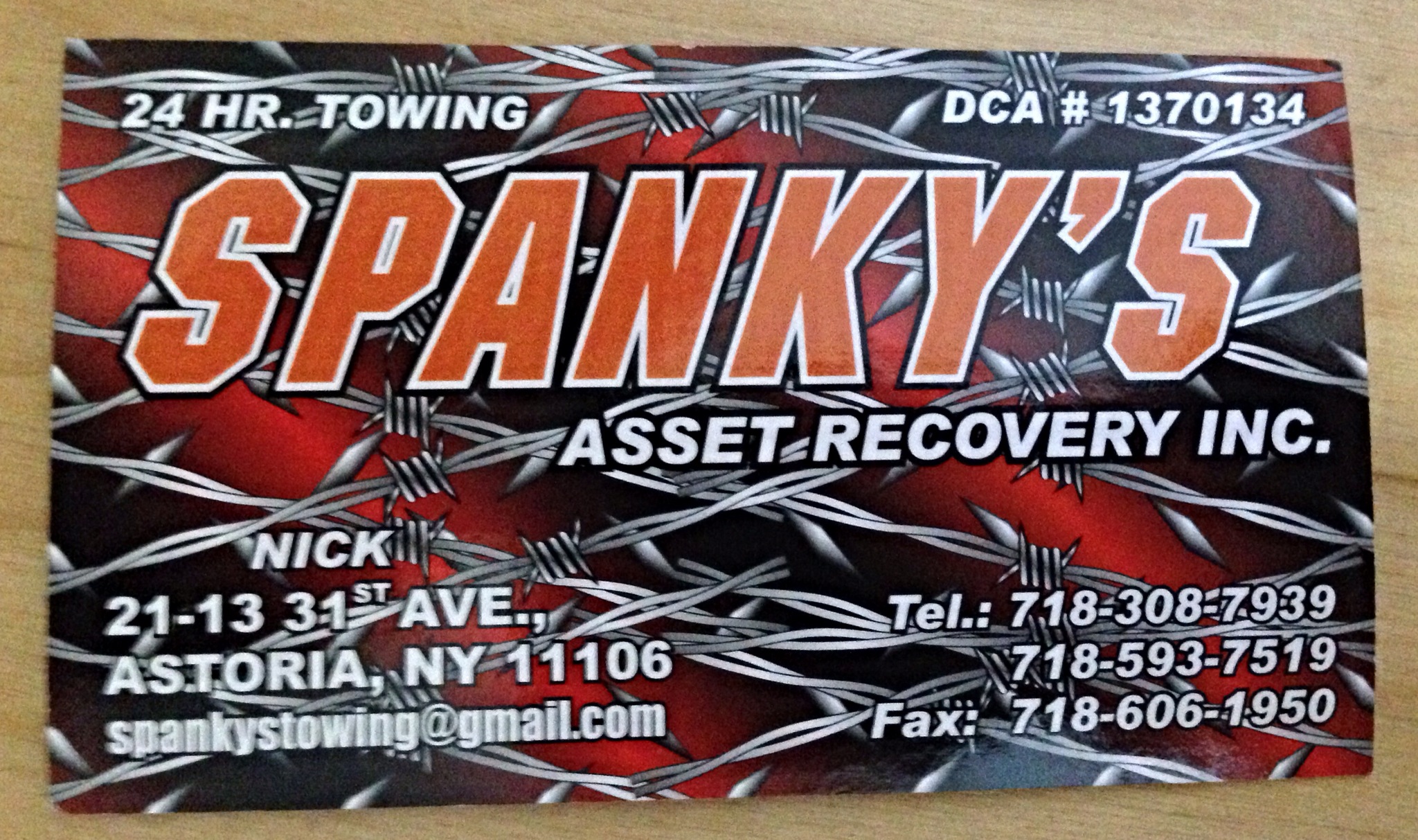 I unwittingly blocked a driveway with my car the other day and it was towed. Mistake, my fault. After vomiting because I thought the car was stolen, and several calls to 311 and the police, I found out the car was towed by Spanky’s Asset Recovery.
