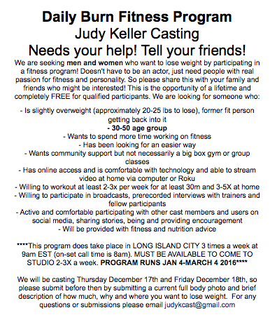 This morning I auditioned for an infomercial/web series for the Daily Burn Fitness Program. I’m kind of perfect because I’m just the sort of out-of-shape person who lives near the TV studio that they’re looking for. That said, I don’t have the gig yet and I might’ve blown it when I told them I prefer working out on my own and don’t like a regimented program (Hey self sabotage, how are you?).